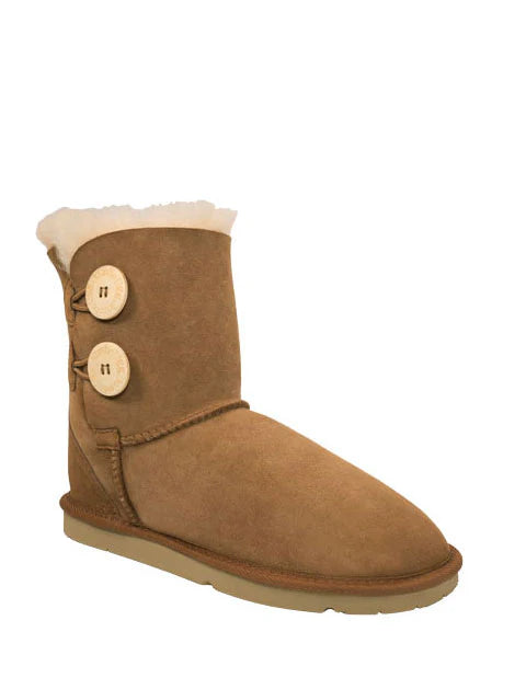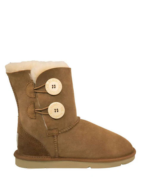 These cute boots feature the classic warmth and comfort that we all know and love, with a great new look! Featuring an open boot style fastened with two cute wooden buttons and elasticised tabs, these boots are functional and funky! The buttons are on the outer edge of each boot, making sure they stand out when you wear them!