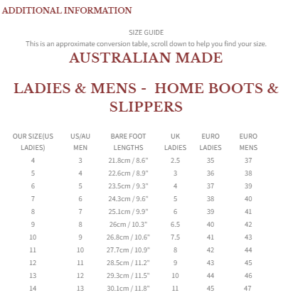 Koalabi Boots are a unisex style and are labelled in AU/USA ladies sizing. Please refer to the size chart for further guidance.