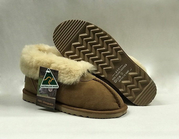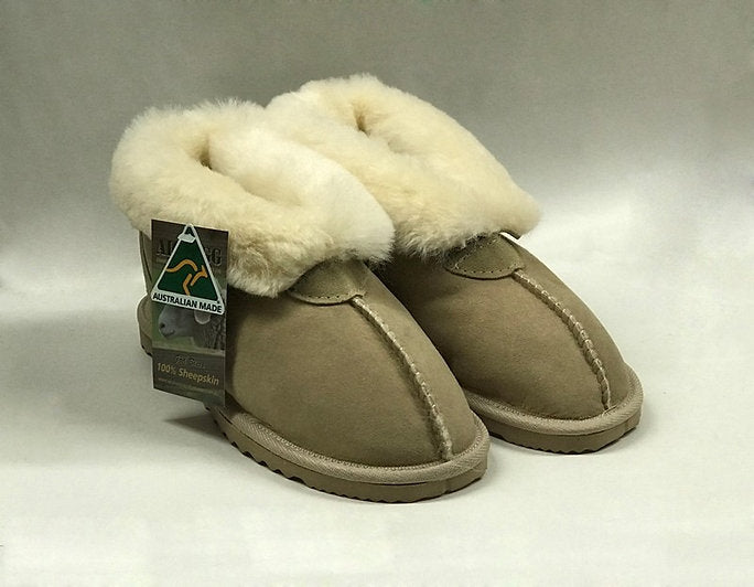 These sheepskin slippers are very easy to slip on and off and the cuff can also be rolled up to give extra warmth to the ankle area. They sit below the ankle area and are generally also suitable for people with a high instep. A great gift choice. Most popular for indoors.